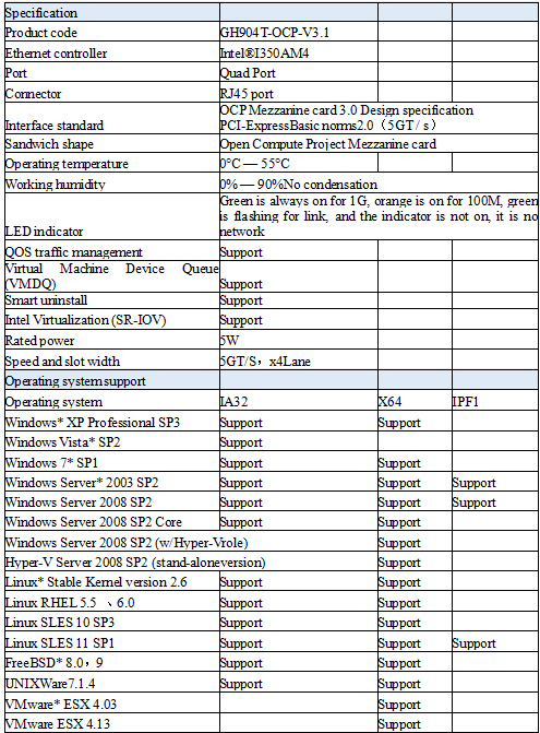 GRT GH904T-OCP-V3.1 RJ45 mezzanine card is based on Intel I350AM4 Ethernet controller, with fully integrated Gigabit Ethernet Media Access Control (MAC) and RJ45 interface. In addition to managing the MAC and PHY Ethernet layer functions, the controller also manages PCI Express packet traffic at its transaction, link and physical/logical layers. Using hardware acceleration, the controller offloads tasks from the host, such as TCP/UDP/IP checksum calculation and TCP segmentation.