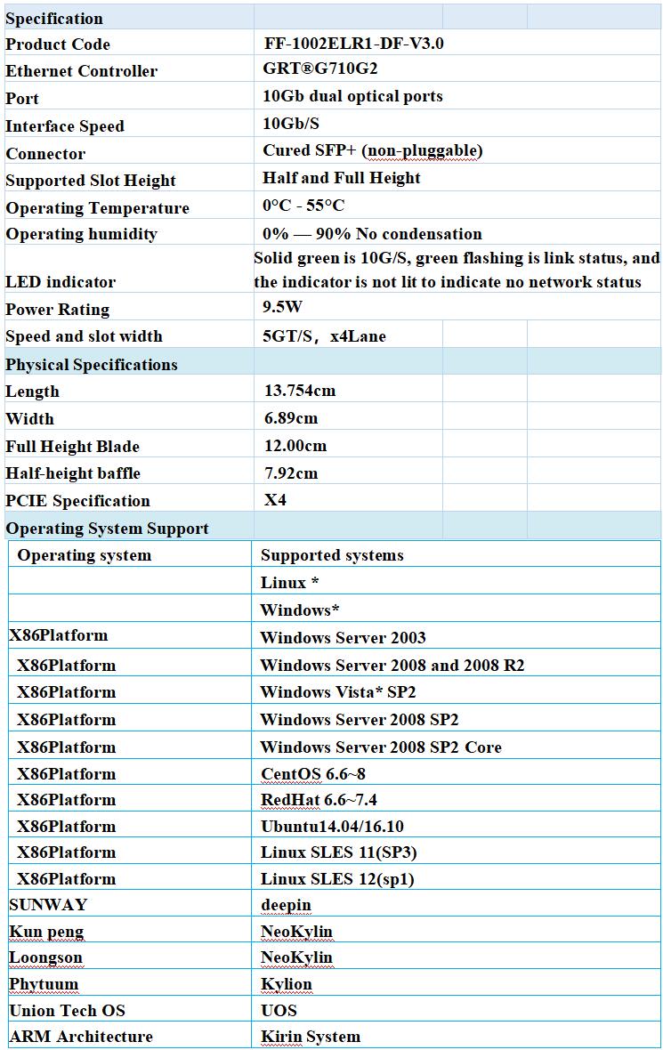 GRT's FF-1002ELR1-DF&DS-V3.0 series Ethernet adapter is a 10 Gigabit single optical port unidirectional Ethernet adapter based on GRT's localized series of chips and adopts the G710G2 Ethernet controller, which is used in servers, firewalls, network gates and other high-end equipment. The adapter is designed to optimize performance so that system I/O is no longer a bottleneck in high-end network applications. The adapter is fault tolerant through bundled groups, where traffic from a failed port is routed to other members of the group. The adapter has integrated hardware acceleration that performs UDP checksum offloading. Host processing technology offloads the gas pedal, freeing up CPU resources to handle other applications. The adapter is an ideal solution for deploying multiple networks and for deploying critical network applications and environments on high-performance servers.