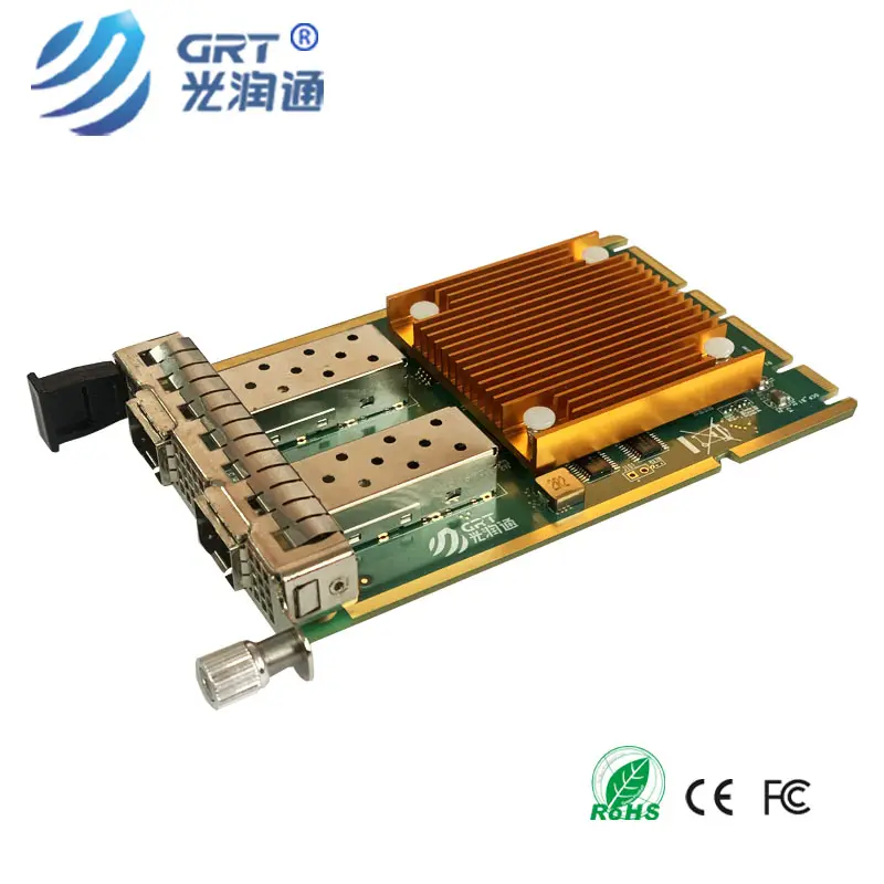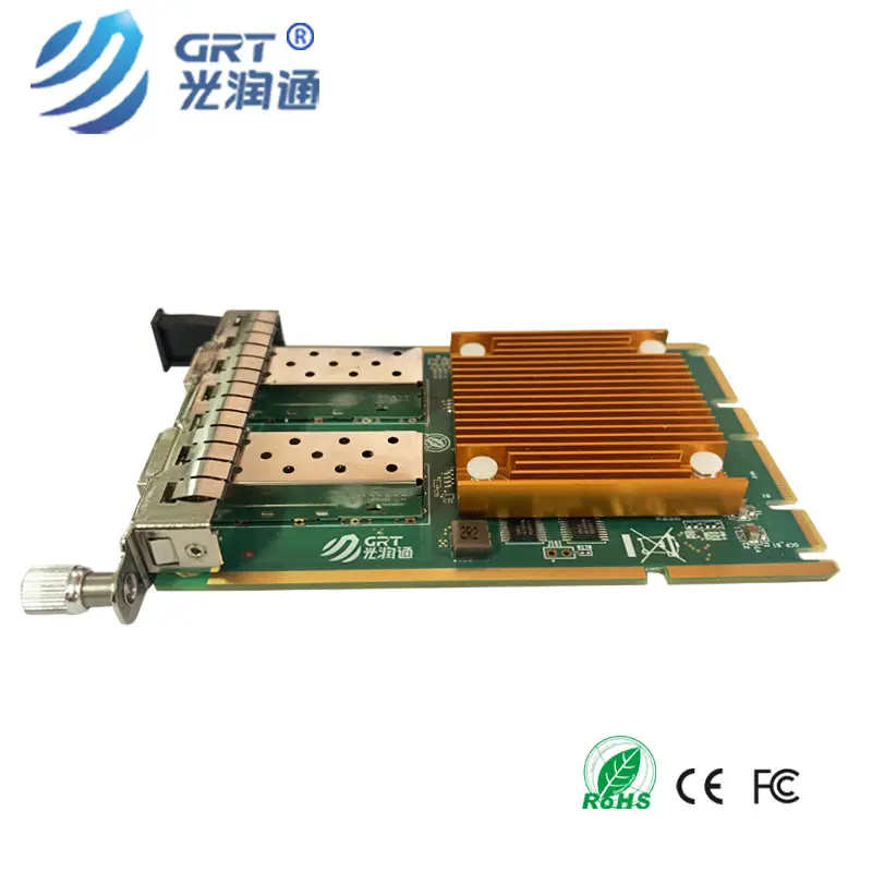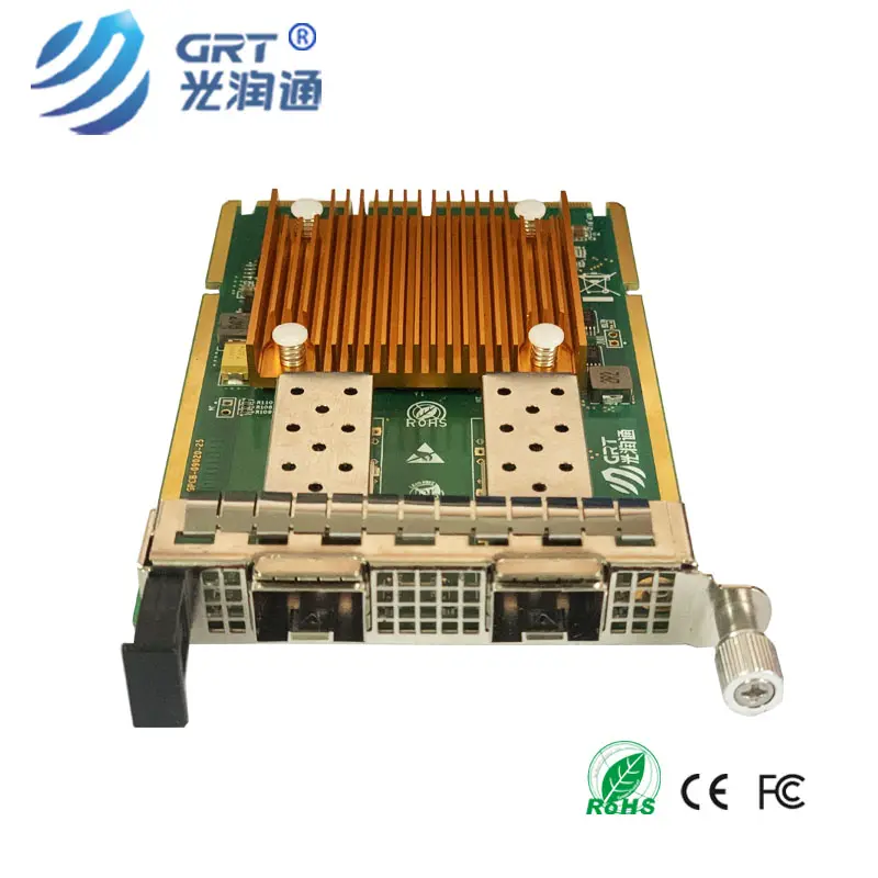 Guangruntong SFP+ 10 Gigabit Ethernet OCP 3.0 Ethernet card, based on Intel X710-BM2 Ethernet controller, with fully integrated 10 Gigabit Ethernet media access control (MAC) and SFI interface. In addition to managing MAC and PHY Ethernet layer functions, the controller also manages PCI Express packet traffic at its transactional, link, and physical/logical layers. With hardware acceleration, the controller offloads tasks from the host, such as TCP/UDP/IP checksum calculation and TCP fragmentation.