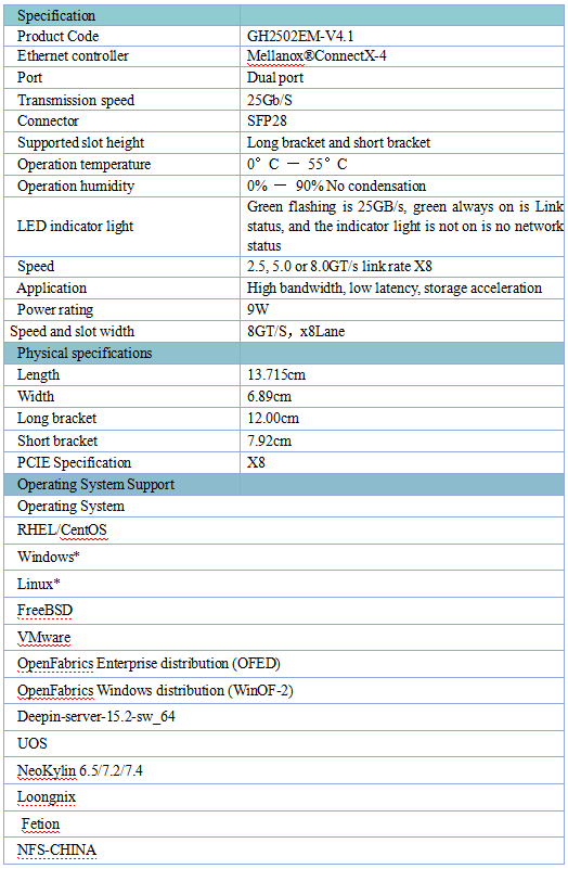 GH2502EM-V4.1 series Ethernet adapter products are 25G dual-port fibre optic
