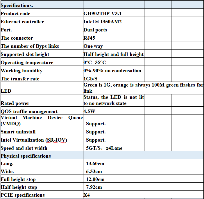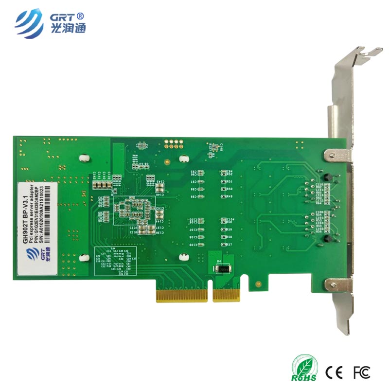 The Gigabit RJ45 electrical port Bypass Ethernet bypass server adapter produced by Guangruntong, GH902TBP-V3.0 is a PCI-Express X4 network interface card, and the adapter contains two Gigabit Ethernet ports. The adapter is oriented to the inline network system, which can facilitate the maintenance of network connection when the network fails.