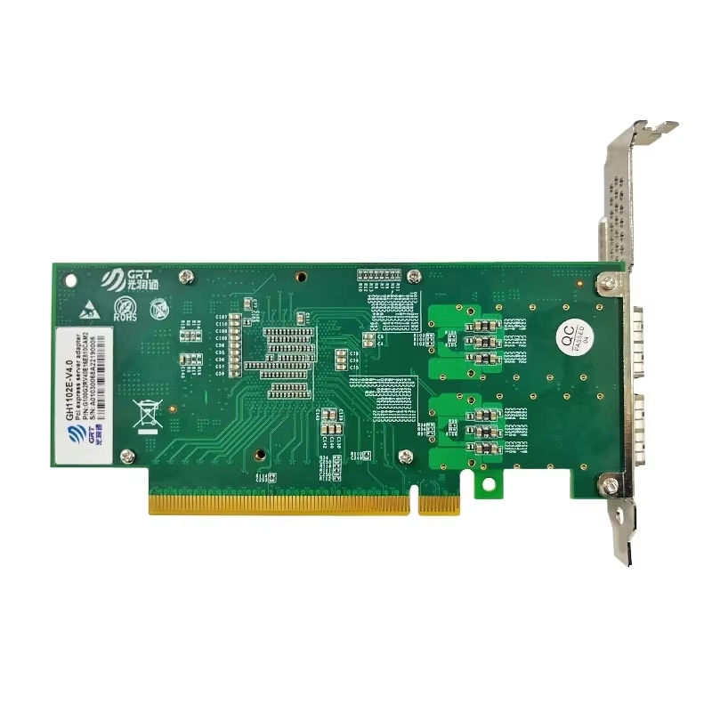 GRT 100 Gigabit Ethernet PCI Express server adapter GH1102E-V4.0 is a PCI Express x16 independently developed on the basis of Intel E810-CAM2 chip solution and MAC+PHY (media access controller and physical interface transceiver). Dual optical port 100G Ethernet adapter, compatible with PCIe X16 channel. This server adapter addresses the needs of next-generation data centers by providing unmatched features for server and network virtualization. Provides reliable performance in flexible LAN and SAN networks.
