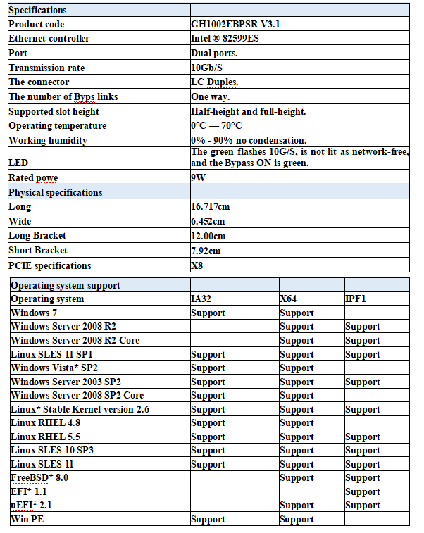 The two-port fiber 10G Ethernet bypass server adapter of the GH1002EBPSR is based on the Intel 82599ES Ethernet controller and offers superior product performance.