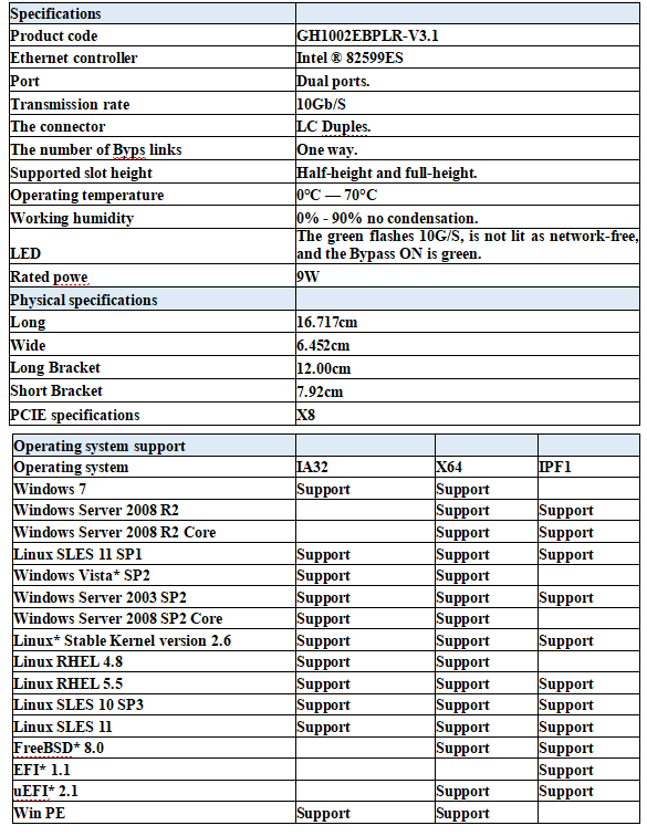 The dual-port fiber 10G Bypass Ethernet bypass server adapter GH1002EBPLR-V3.1 is a PCI-Express X8 network interface card that contains two fiber optic (SR, LR) 10G Ethernet ports on the PCI-E adapter. The GH1002EBPLR adapter is intended for inline network systems and maintains network connectivity in the event of a system failure.
