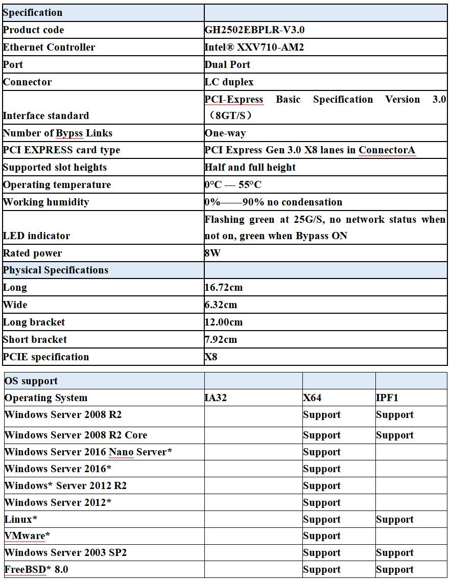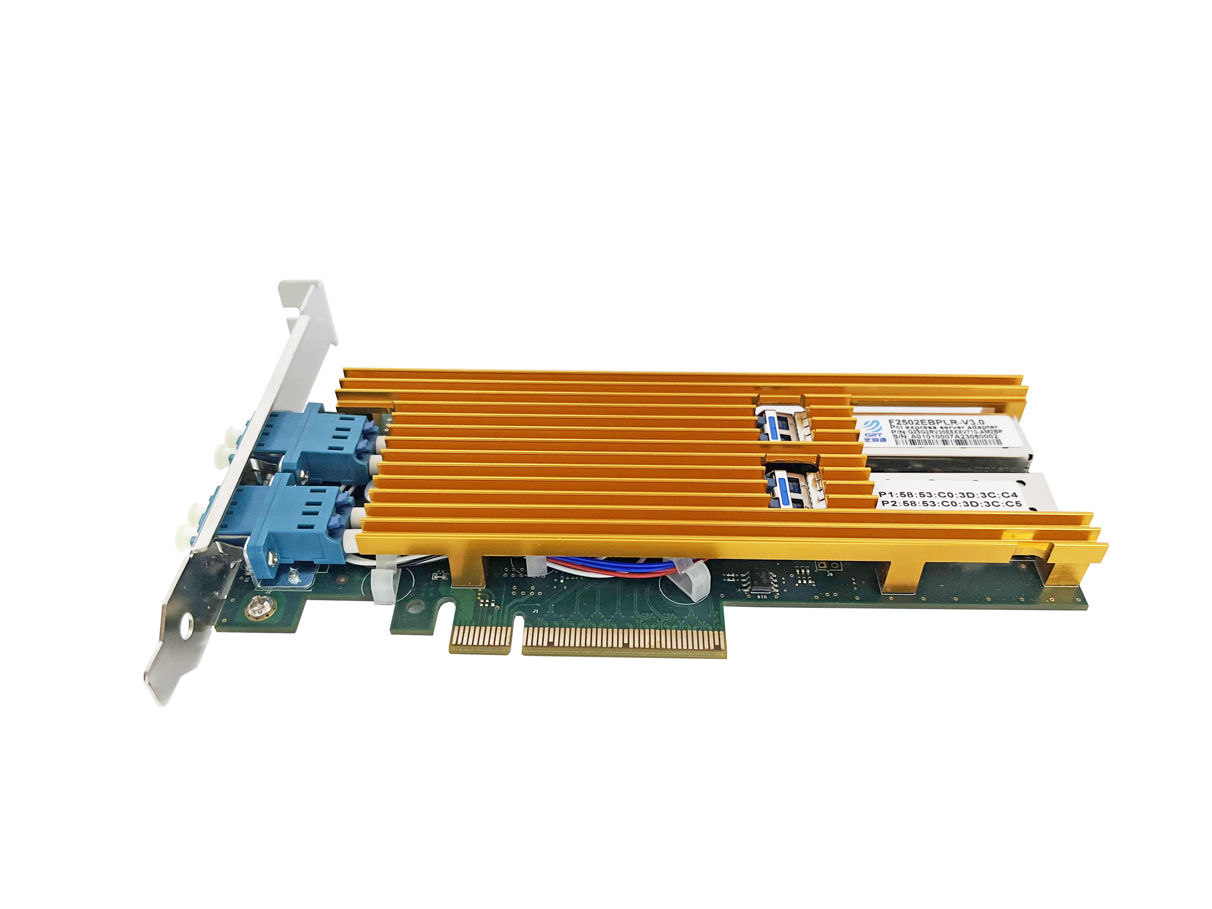 GRT GH2502EBP's dual-port fiber 10 Gigabit Ethernet bypass server adapter is based on Intel XXV710-AM2 Ethernet controller and has superior product performance.