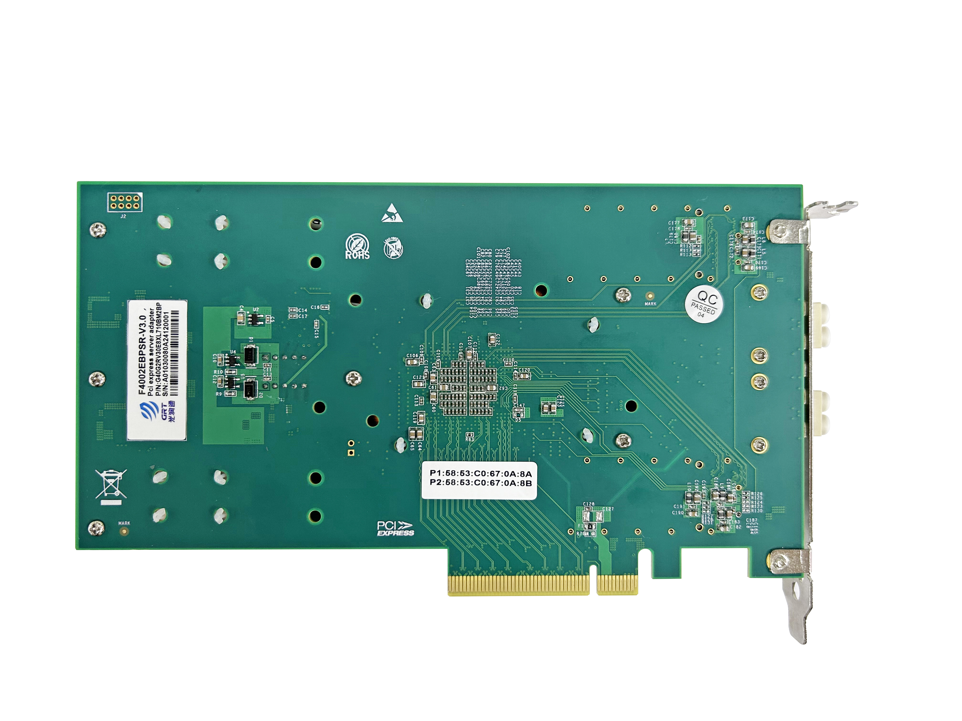 The GRT Single Dual-Port Fiber Optic 40G Gigabit Bypass Ethernet Server Adapter GH4002EBPSR-V3.0 is a PCI-Express X8 network interface card that includes two fiber optic (SR) 40 Gigabit Ethernet ports on a PCI-E adapter. This adapter is geared toward inline network systems and maintains network connectivity in the event of a system failure.
