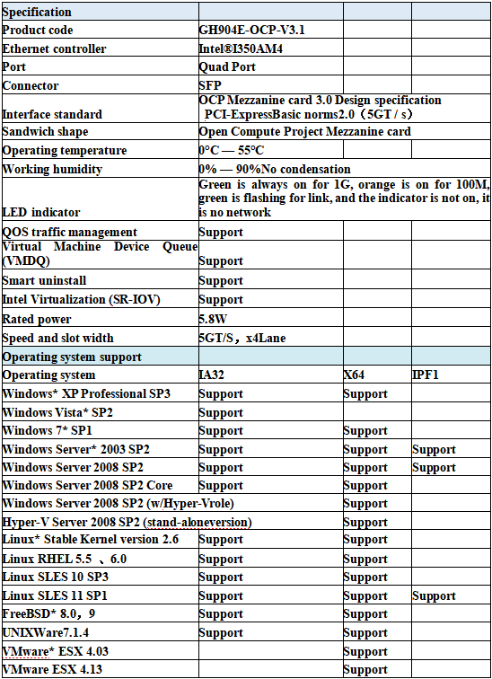 Guangruntong GH904E-OCP-V3.1 SFP mezzanine card is based on Intel I350AM4 Ethernet controller, with fully integrated Gigabit Ethernet Media Access Control (MAC) and SFP interface. In addition to managing the MAC and PHY Ethernet layer functions, the controller also manages PCI Express packet traffic at its transaction, link and physical/logical layers. Using hardware acceleration, the controller offloads tasks from the host, such as TCP/UDP/IP checksum calculation and TCP segmentation.